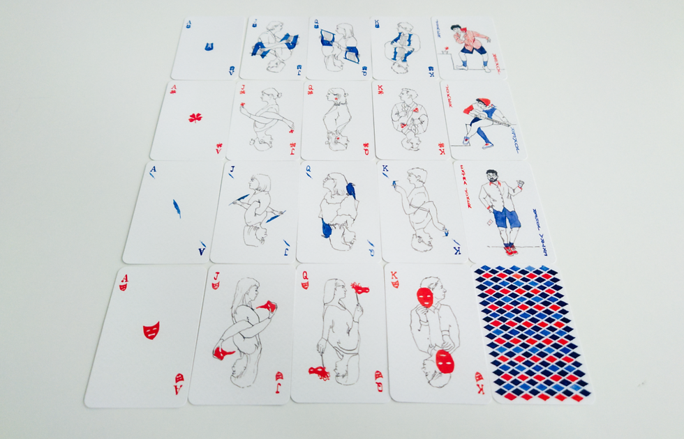 This deck features a set of 52 playing cards plus 3 jokers with custom suits: strings, clovers, feathers, and masks. Each card has been individually hand-drawn with ink on paper and reproduced in this limited facsimile edition of 100 copies.